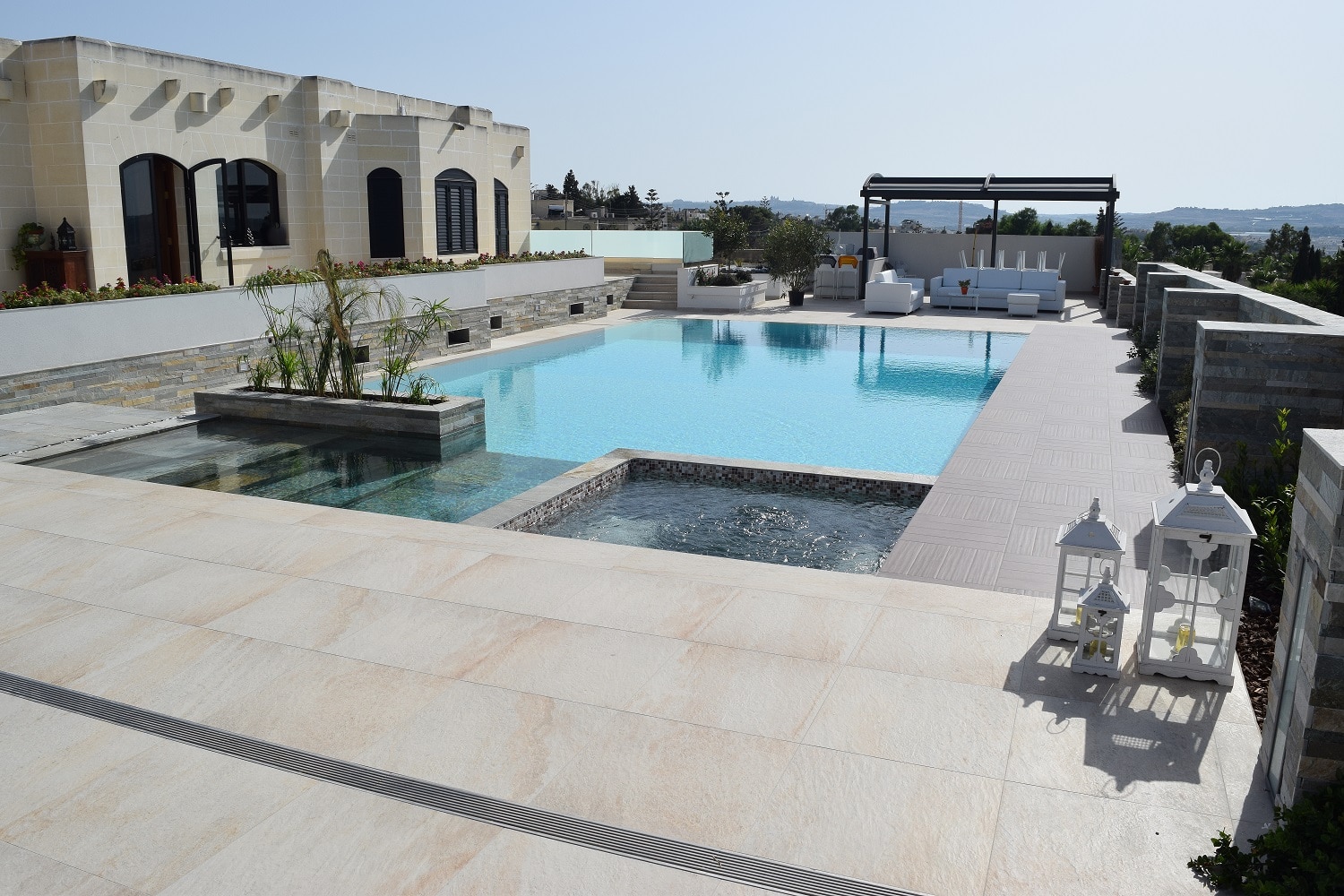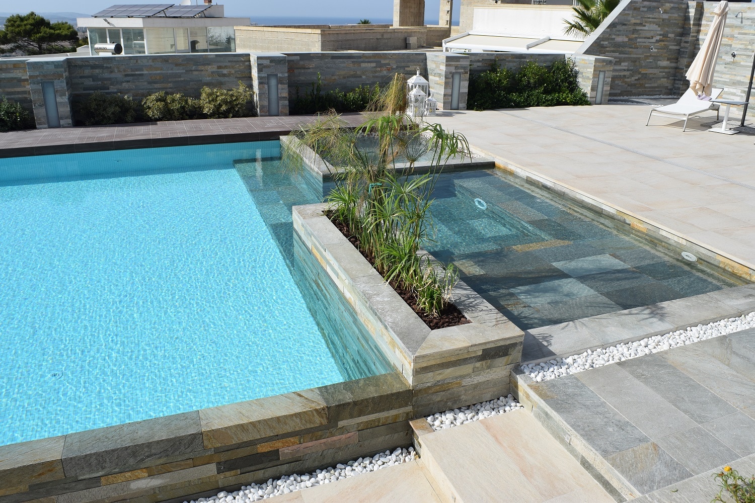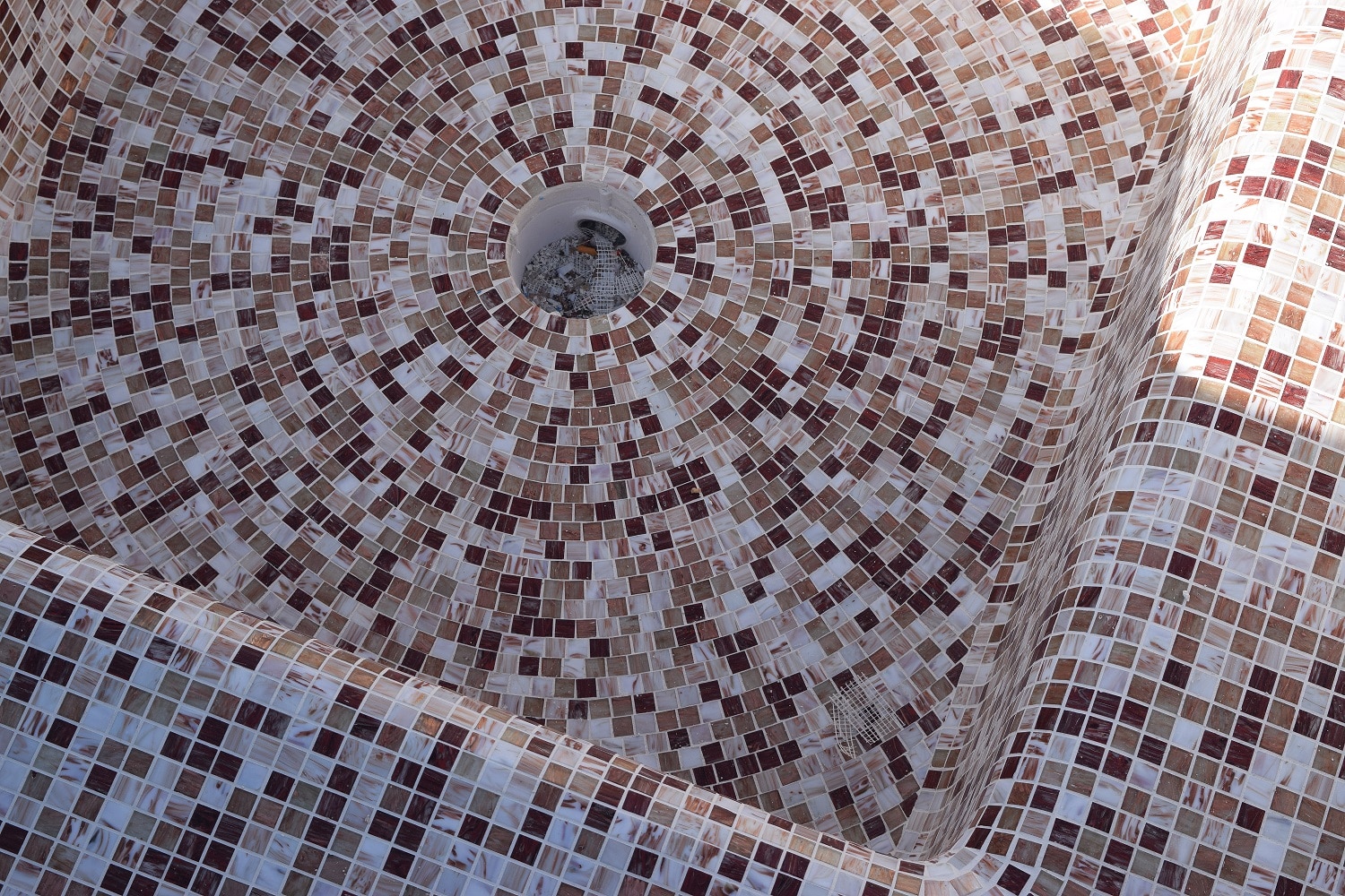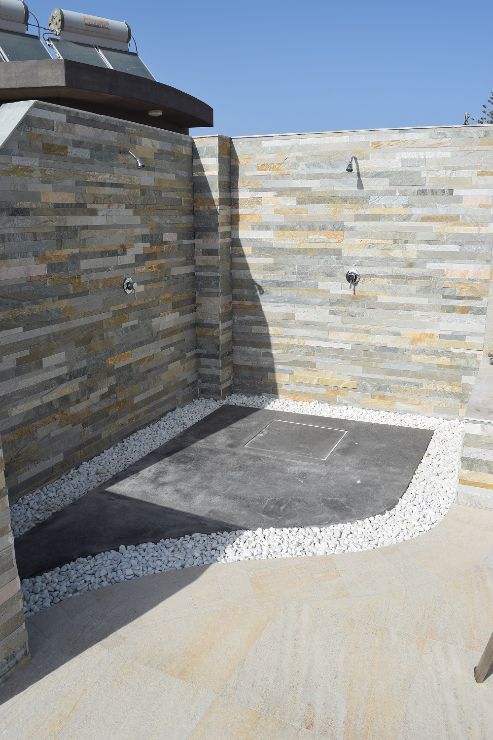 Shower tray in Pieta Lavica & wall cladding in Murales multi colour